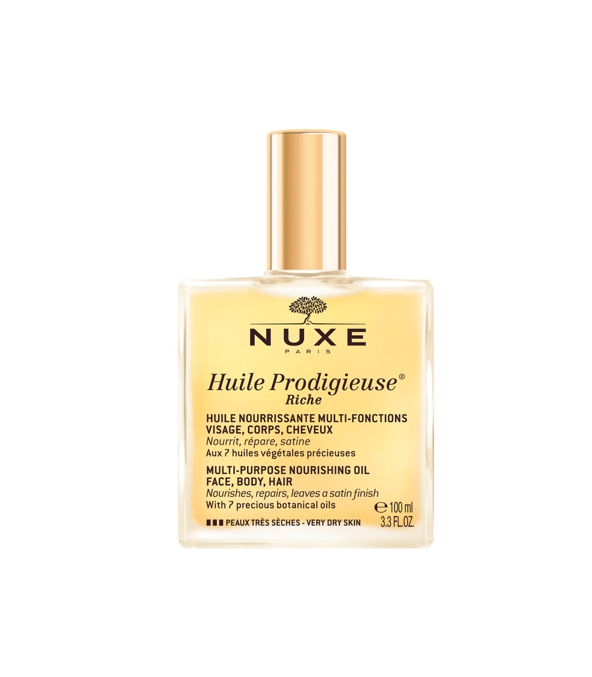 Déjate cautivar por el cóctel mítico de 7 aceites preciosos 100% vegetales de Huile Prodigieuse® Riche en una versión enriquecida, para nutrir, reparar y satinar en un solo gesto rostro, cuerpo y cabello.