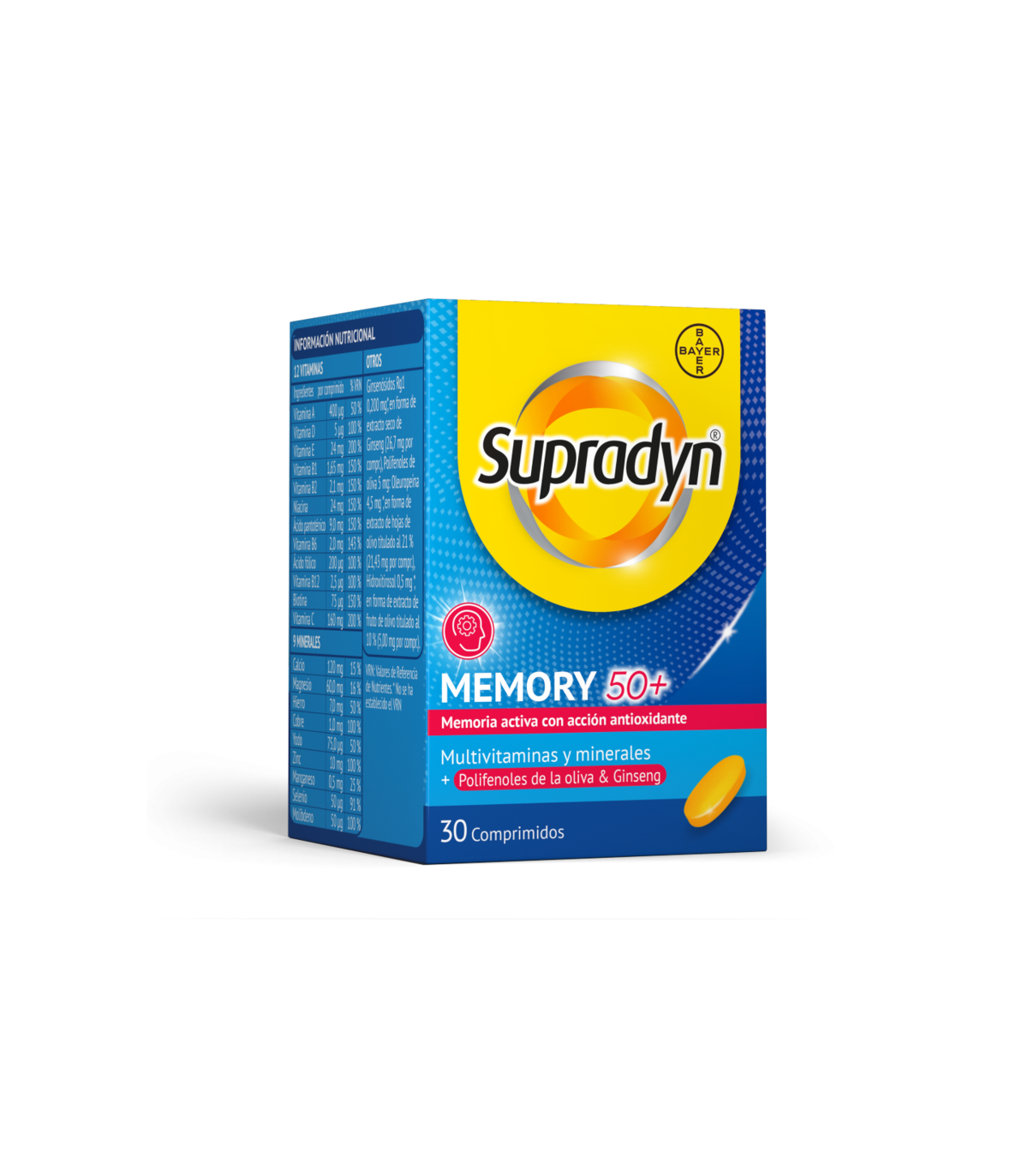 Supradyn® Memory 50+ es un complemento alimenticio específicamente formulado con vitaminas para la memoria, un multivitamínico para personas mayores de 50 años, a base de 12 vitaminas y 9 minerales que aportan energía y vitalidad, con polifenoles de la oliva y ginseng de origen natural. Los multivitamínicos Supradyn® contienen vitaminas para la memoria y la concentración en adultos, una opción para añadir en el día a día y mejorar el rendimiento mental.